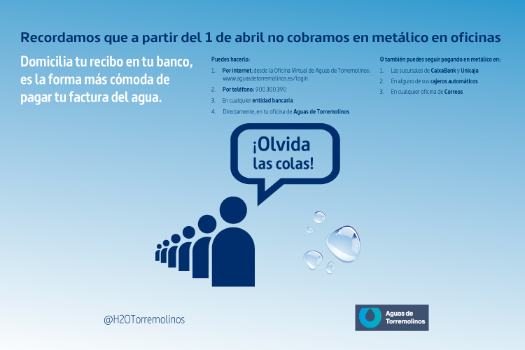 Con el fin de mejorar el sistema de atención al cliente y de agilizar los trámites a la hora de pagar los recibos de agua, Aguas de Torremolinos ha decidido dejar de realizar cobros en efectivo en sus oficinas a partir del próximo 1 de abril.
